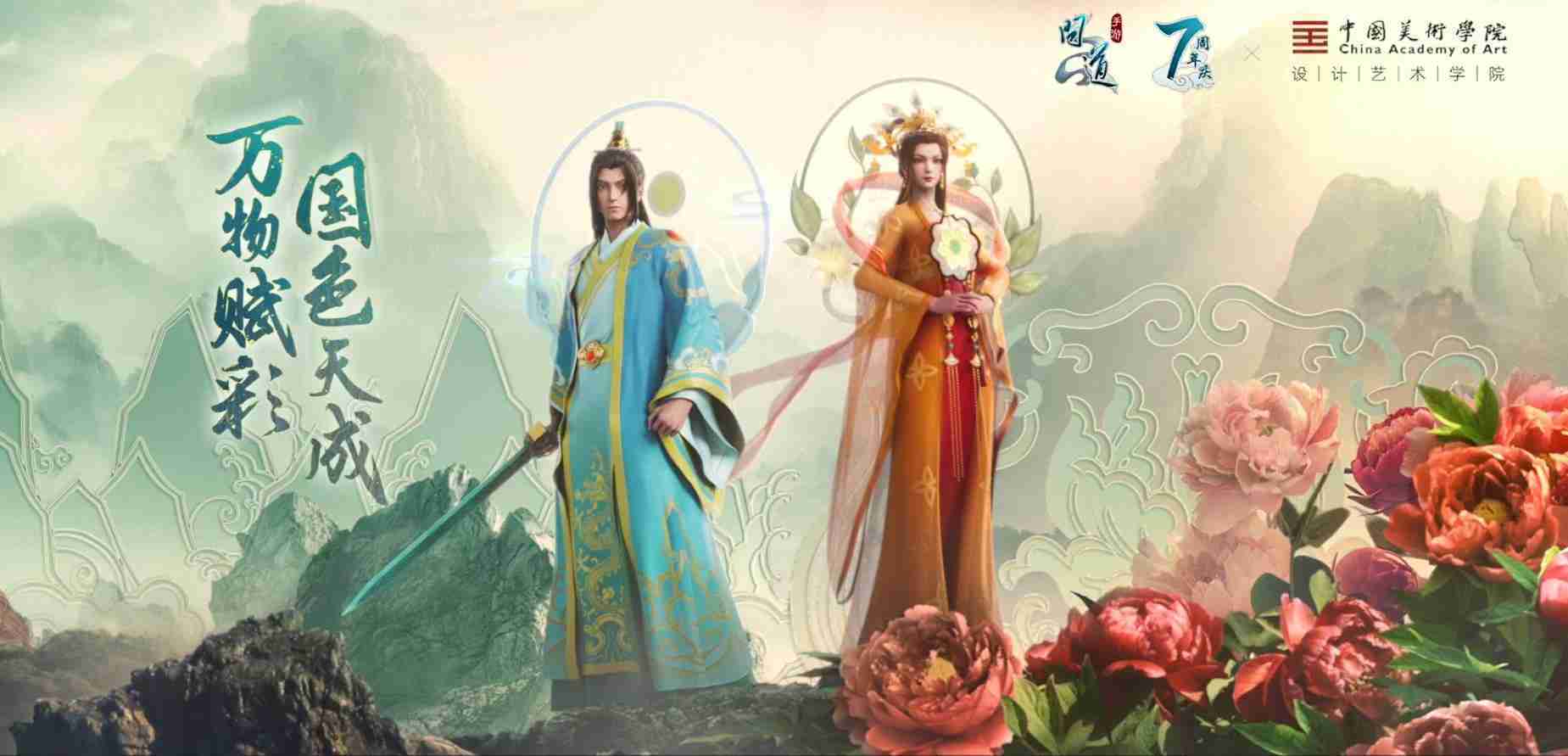 2023年4月,,《问道手游》联动中国美术学院,,,,在游戏中融合了中国历史上不同时期的文化元素,,,,打造了“山河万象”与“凤鸣九霄”的国风时装。。。在色彩配置方面,,创作团队基于对游戏角色特性的分析提取相应的文化内涵,,从每一种色彩的色相、、、指代事物和情感出发对应角色属性,,选定服装的色彩搭配。。。在纹样设计方面,,,创作团队结合游戏角色自身特殊的造型比例和形态,,,,在实际的纹样设计中进行了游戏语境下的活化演绎。。男性角色集中使用了如蟒纹、、海水江崖纹、、如意纹和云气纹等传统纹样元素,,女性角色则吸纳了凤凰纹、、、牡丹纹、、卷草缠枝纹等元素,,组成以“双凤牡丹纹样”“缠枝牡丹纹”“金玉凤冠头饰”为主要纹样的游戏角色装饰图案系统。。